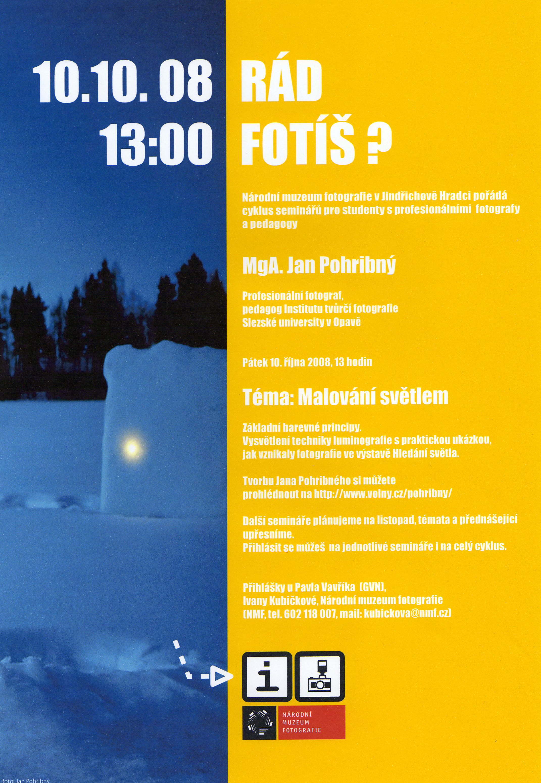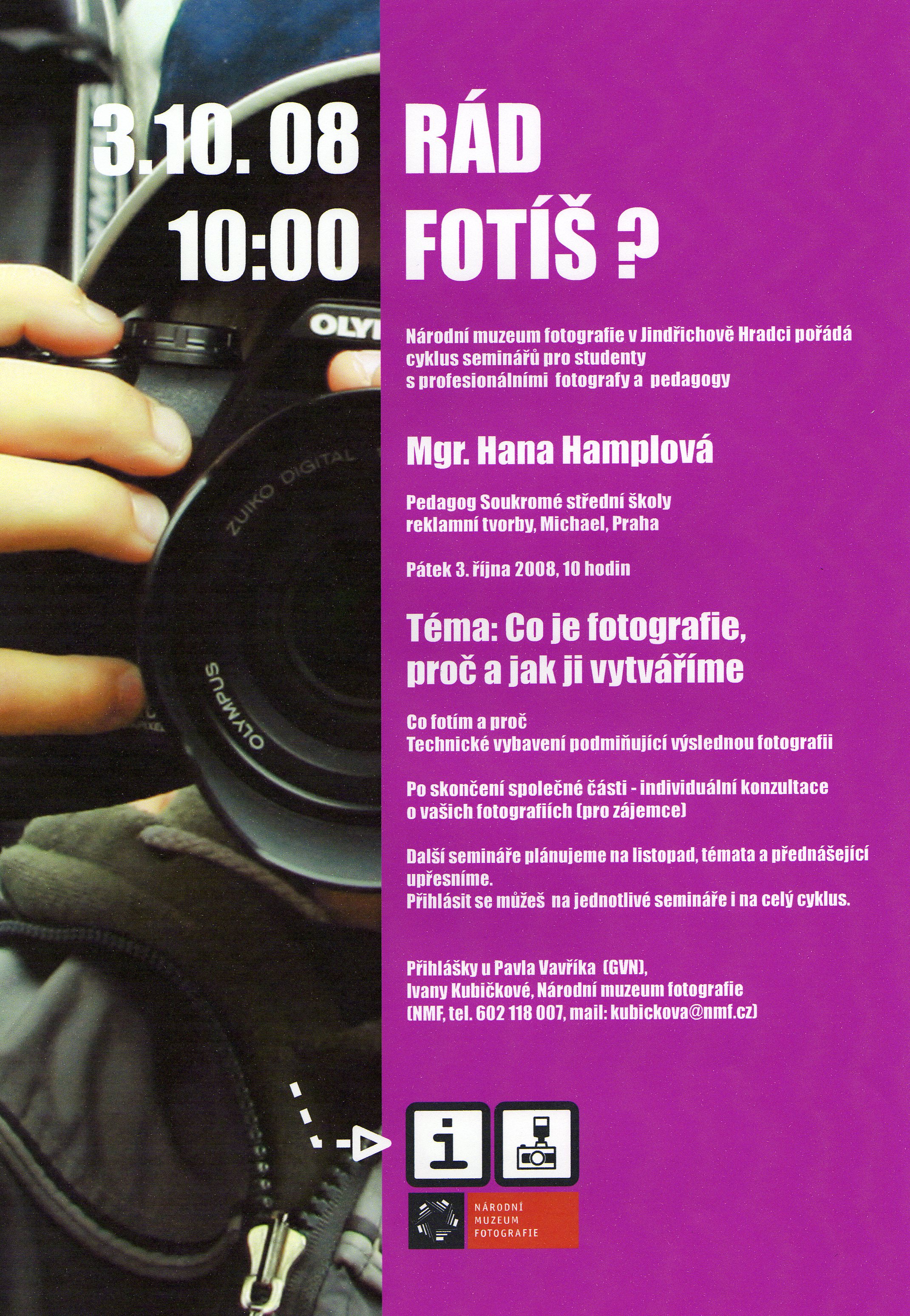 2. Dne 10.října 2008 od 13.0 hod. pořádá Národní muzeum fotografie v Jindřichově Hradci cyklus seminářů pro studenty s profesionálními fotografy a pedagogy.