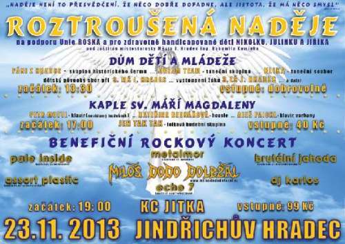 V sobotu, dne 23.11.2013 od 19:00, se uskuteční v KC JITKA v Jindřichově Hradci benefiční rockový koncert "ROZTROUŠENÁ NADĚJE". Zakoupením vstupenky na koncert a ev. tomboly, přispějete Unii ROSKA J. Hradec (lidé postiženi roztroušenou sklerózou) a handicapovaným dětem (Jiříkovi, Julince a Nikolce).