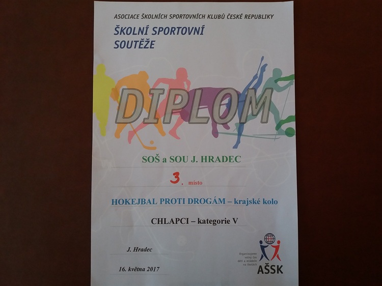 - HOKEJBAL PROTI DROGÁM - krajské kolo se uskutečnilo 16.5.2017 na hokejbalovém hřišti u VI. ZŠ na Sídlišti Hvězdárna v J.Hradci. Družstvo chlapců pod vedením Ondřeje Bušty ze 3.AB (SOŠ) obsadilo celkové 3. místo.