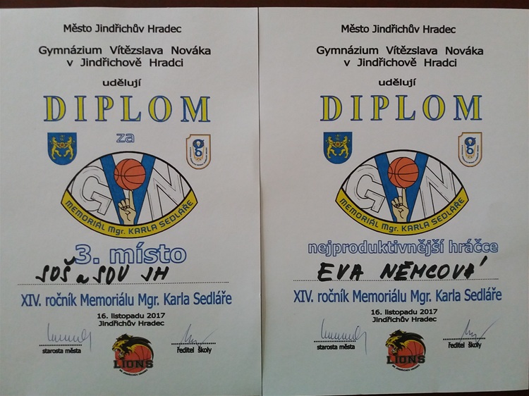 MEMORIÁL MGR. KARLA SEDLÁŘE - se uskutečnil 16.11.2017 v nové sportovní hale v Jindřichově Hradci. Smíšené družstvo chlapců a dívek ze SOŠ a SOU JH