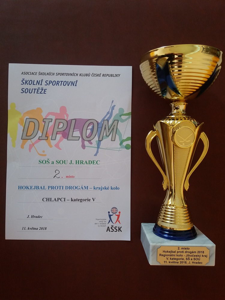 HOKEJBAL PROTI DROGÁM - okresní kolo se konalo 19.4.2018 na hokejbalovém hřišti u VI. ZŠ na Sídlišti Hvězdárna v J.Hradci. Družstvo chlapců SOŠ a SOU JH pod vedením Antonína Klenota (4.AB SOŠ) postoupilo do krajského kola. Gratulujeme.