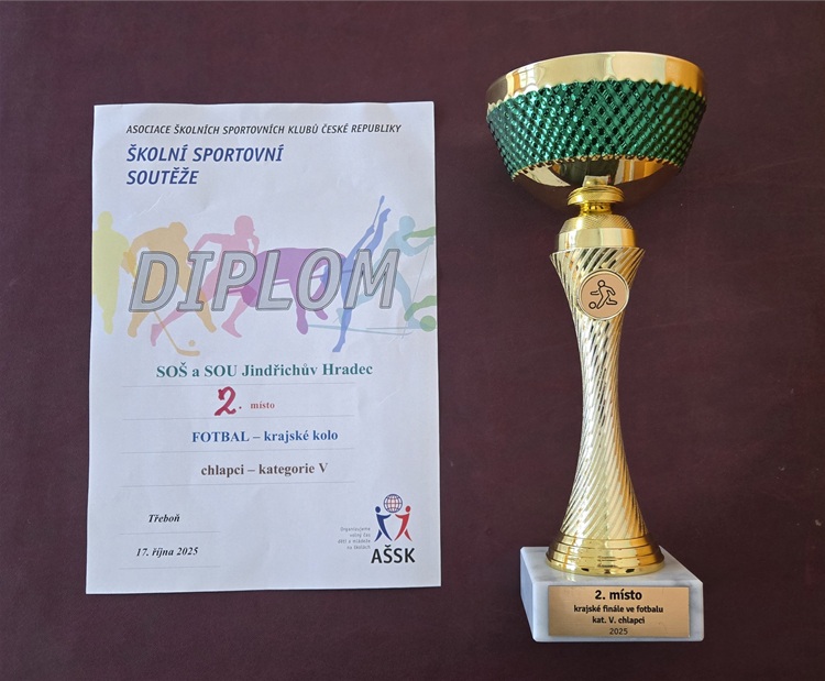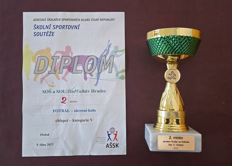 - FOTBAL KRAJSKÉ kolo se uskutečnilo 17.10.2025 v Třeboni. Družstvo chlapců za SOŠ a SOU JH pod vedením Rostislava Škardy (4.A, SOŠ) vybojovalo celkové 2.místo, však smolně se připravili o postup do REPUBLIKOVÉHO FINÁLE. Přesto VELKÁ GRATULACE.