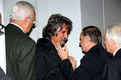 Otec zesnulého motocyklisty Marca Paolo Simoncelli (uprostřed) přijímá kondelenci šéfa italského olympijského výboru Gianna Petrucciho.